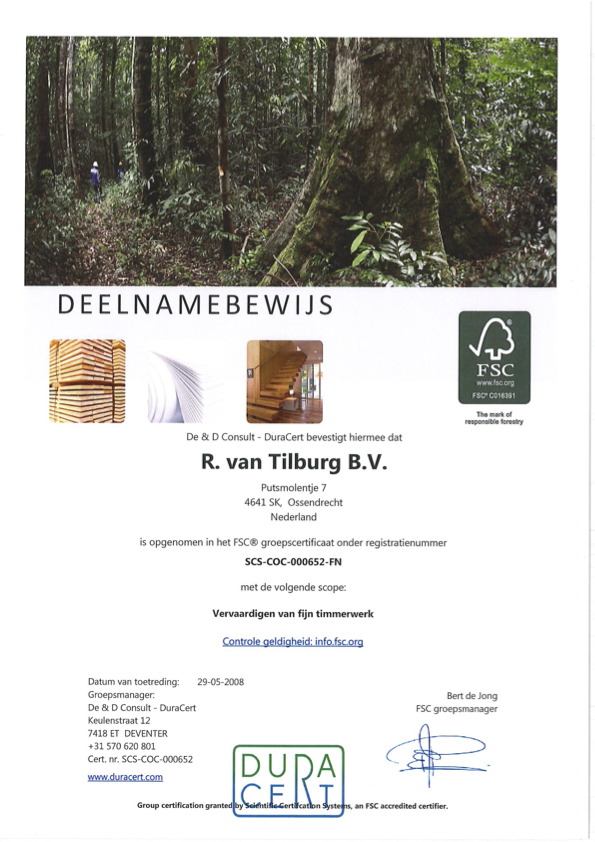 Al sinds 2008 werkt Van Tilburg Kozijnen met FSC®-gecertificeerd hout. Dat betekent dat het hout dat wij gebruiken afkomstig is uit verantwoord beheerde bossen. Het FSC-keurmerk (Forest Stewardship Council®) garandeert dat er bij de houtproductie rekening wordt gehouden met milieu, mens en economie. Door te kiezen voor FSC-hout dragen wij bij aan het behoud van bossen wereldwijd en ondersteunen we eerlijke arbeidsomstandigheden in de bosbouwketen. Ons FSC-certificaatnummer: SCS-COC-000652-FN